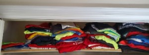 These are my stacks of short sleeve tech shirts. This is in excess of 100. I pull from the left stack. Laundered and new shirts go on the right stack. Once the left stack is exhausted, I slide the stacks to the left. There are more new surprises buried in these stacks.